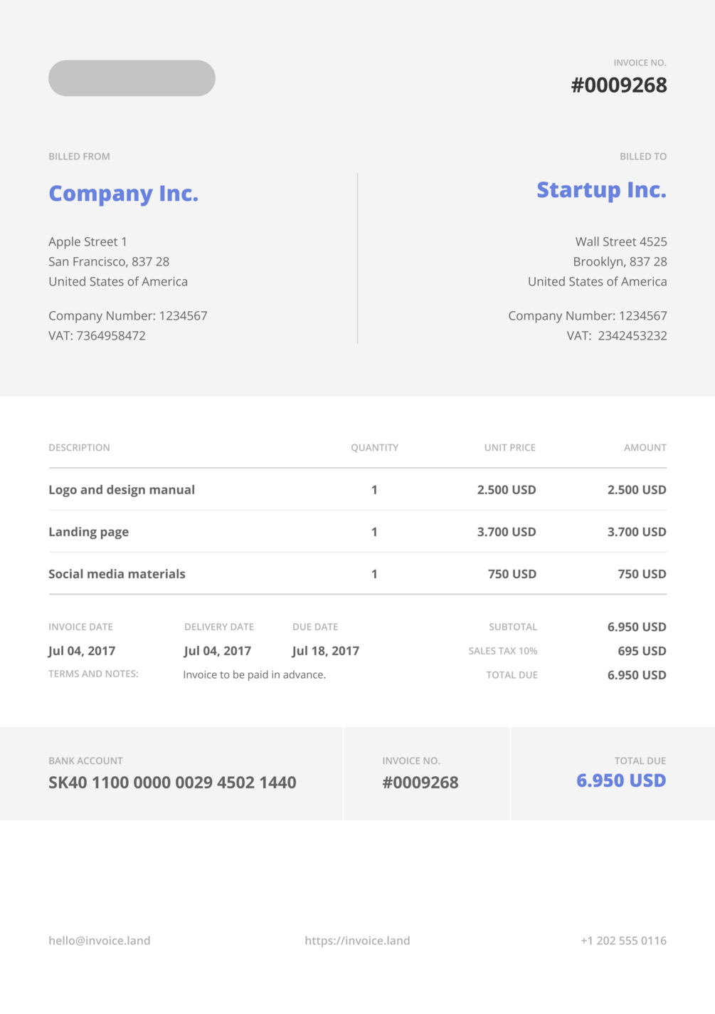 Professional FREE invoice template to bill for products or services. Easy to edit in multiple file formats, such as PDF, Sketch, Figma or Adobe Illustrator file. You can easily change any text or number in attached files. Edited invoice template send to your customer.